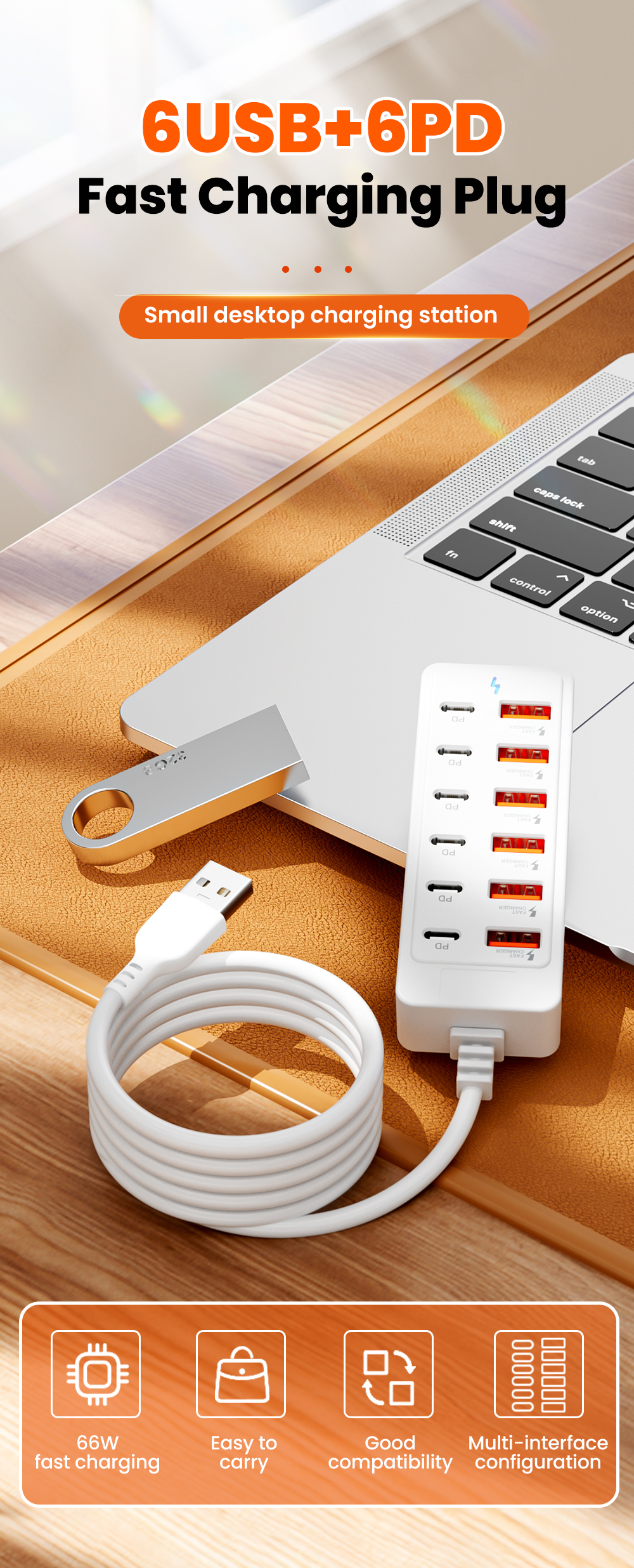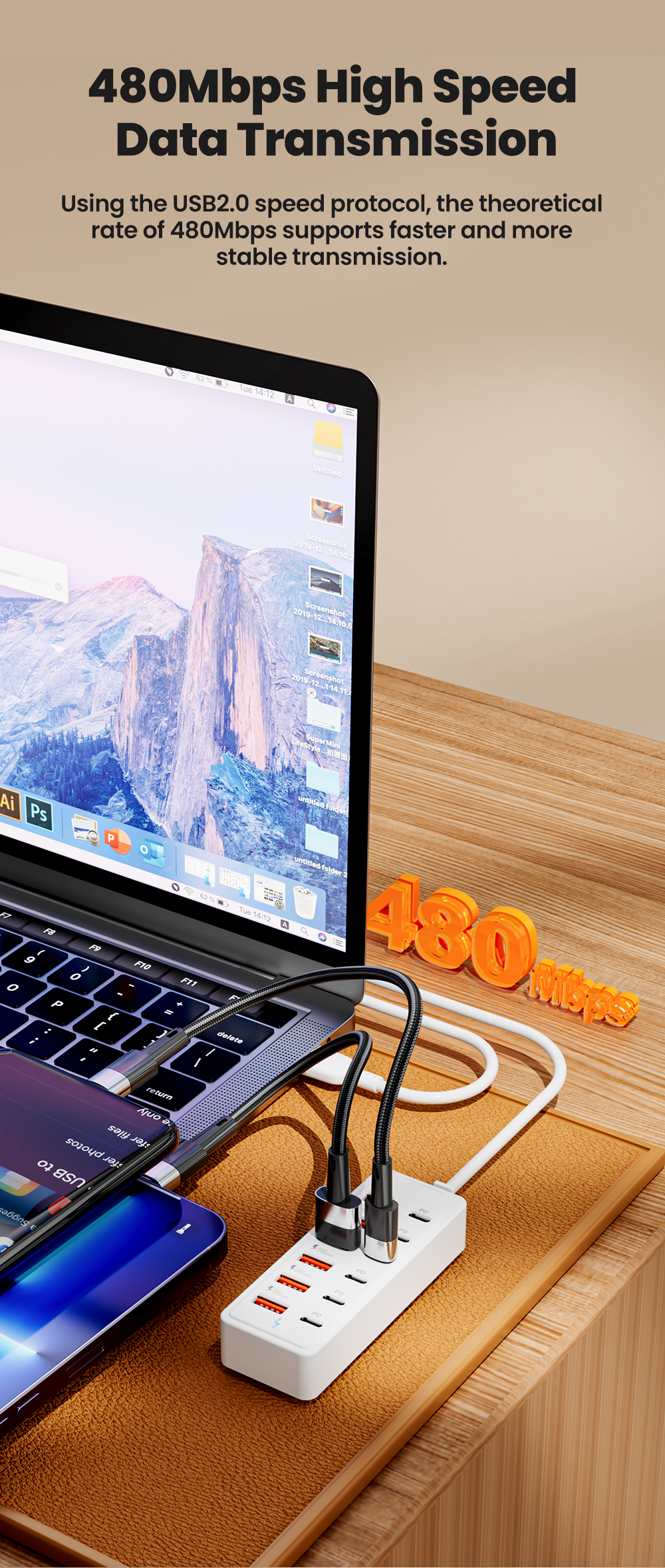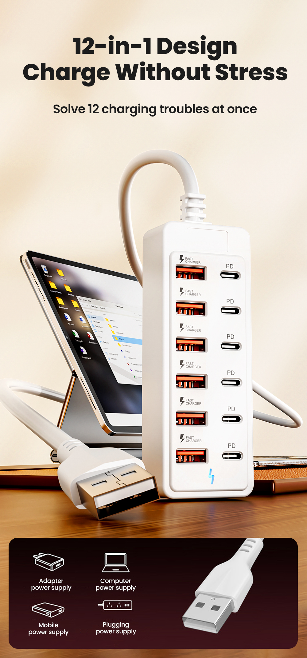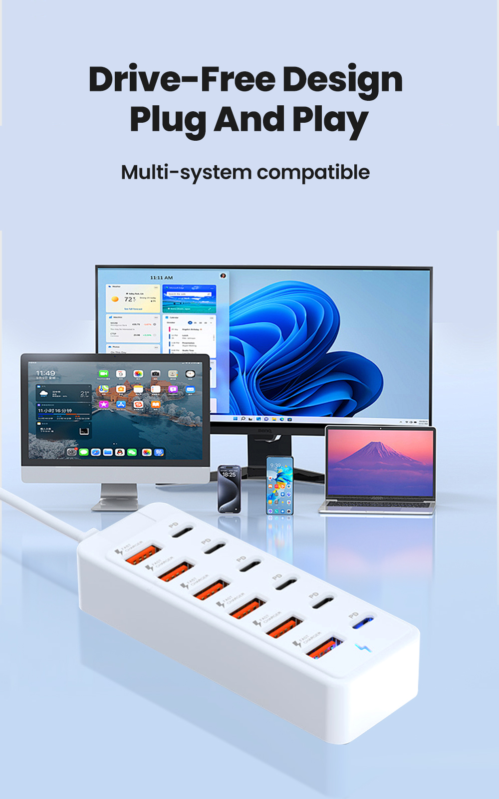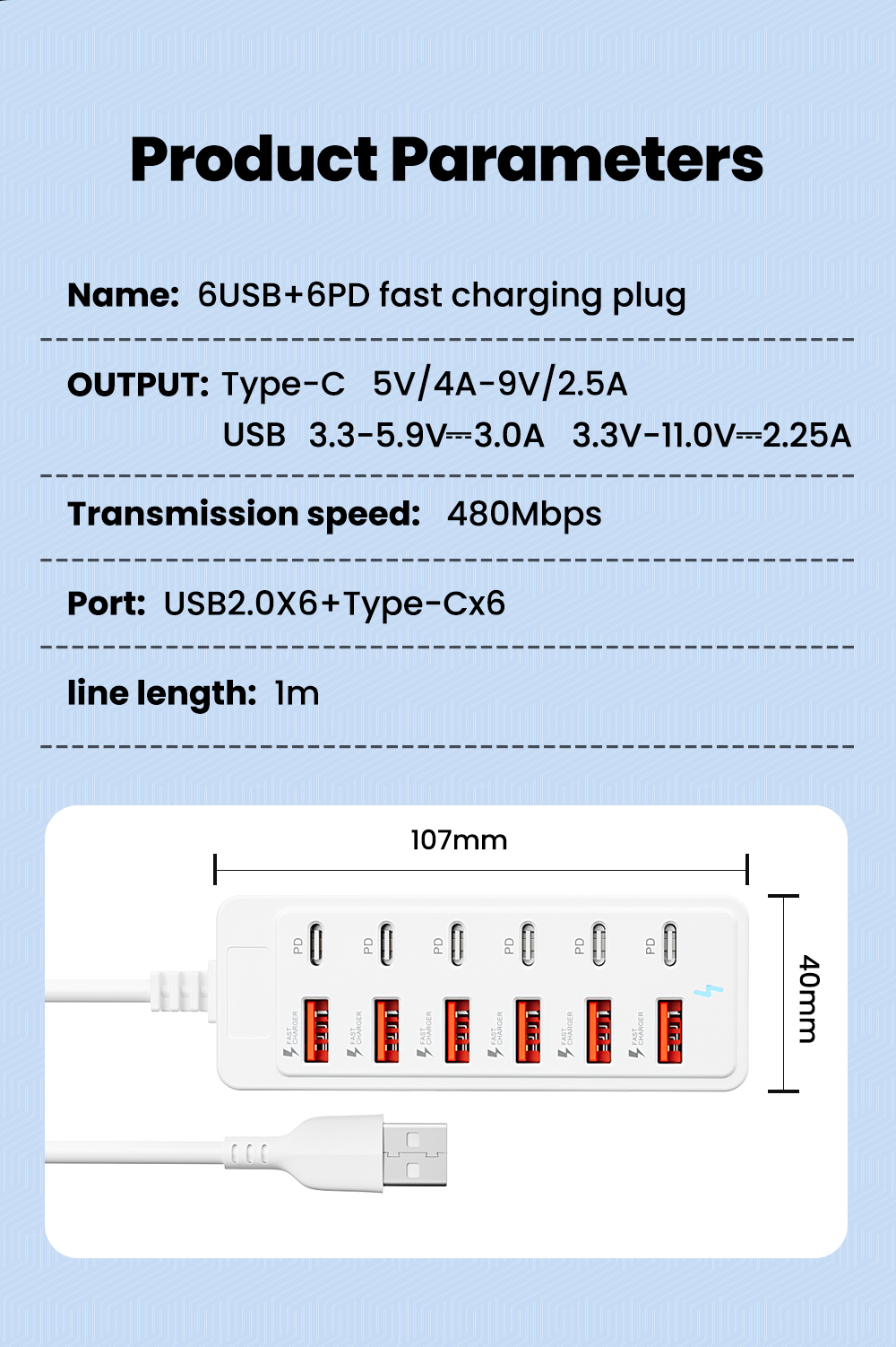 12-in-1 USB Splitter Socket USB2.0 High Speed Data Transfer Converter USB C Docking Station Fast Charging Plug for Home Office