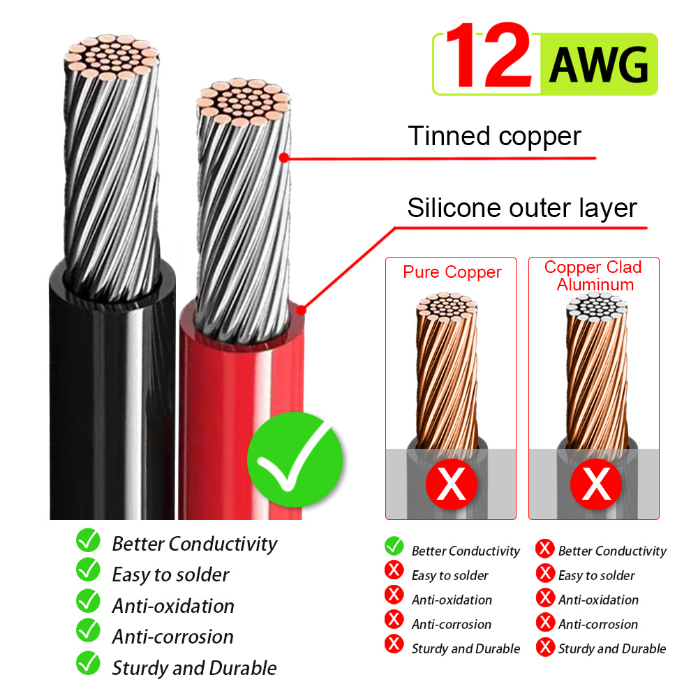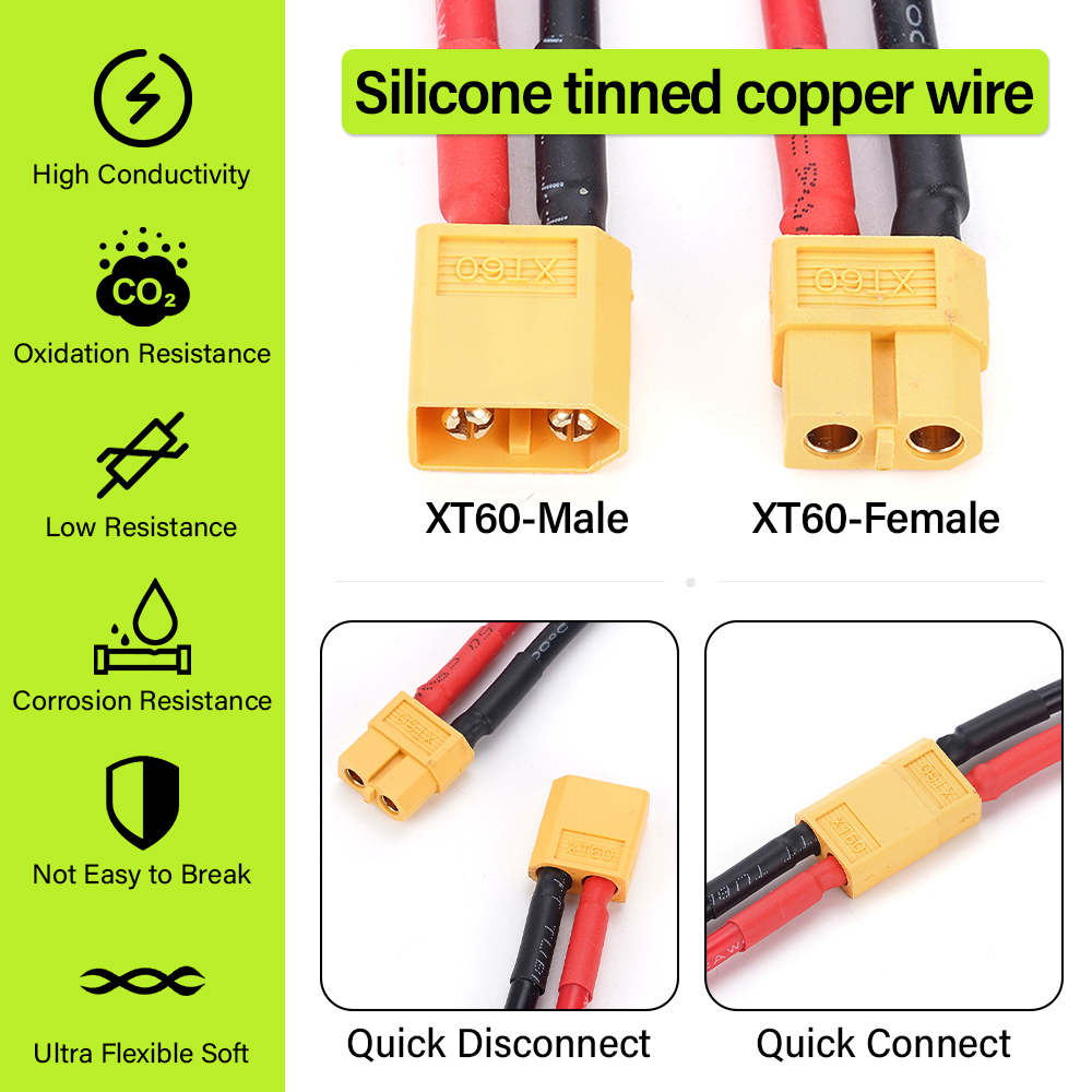 The XT60 female and male connector cable uses 12AWG wire gauge, high quality silicone tinned copper material, can also work in harsh environments, working range of -50℃-200℃。Ensure better performance while being safer to use