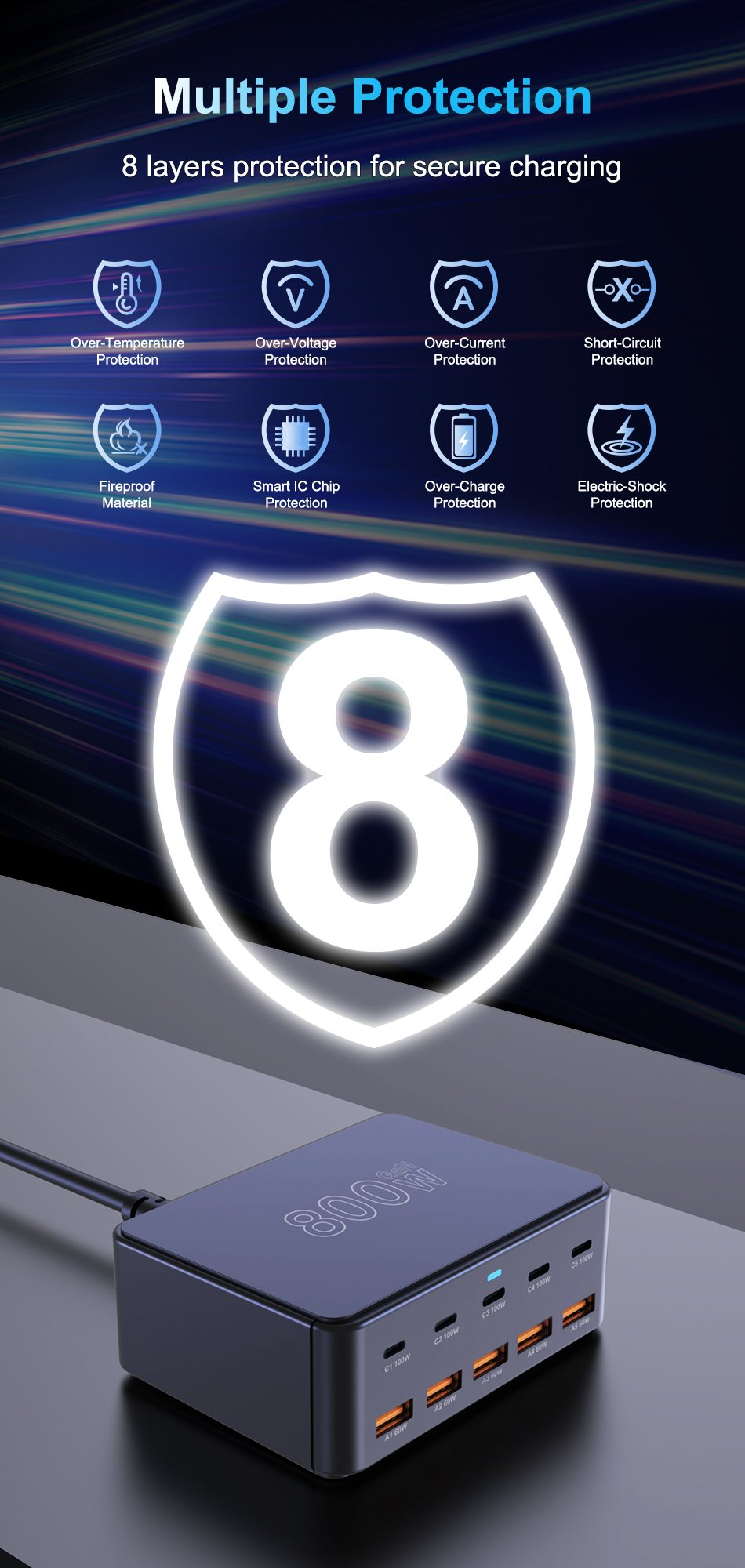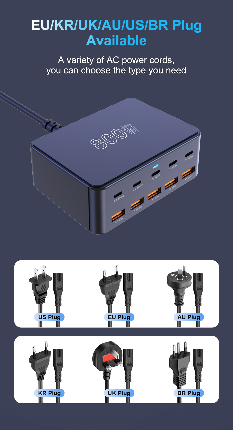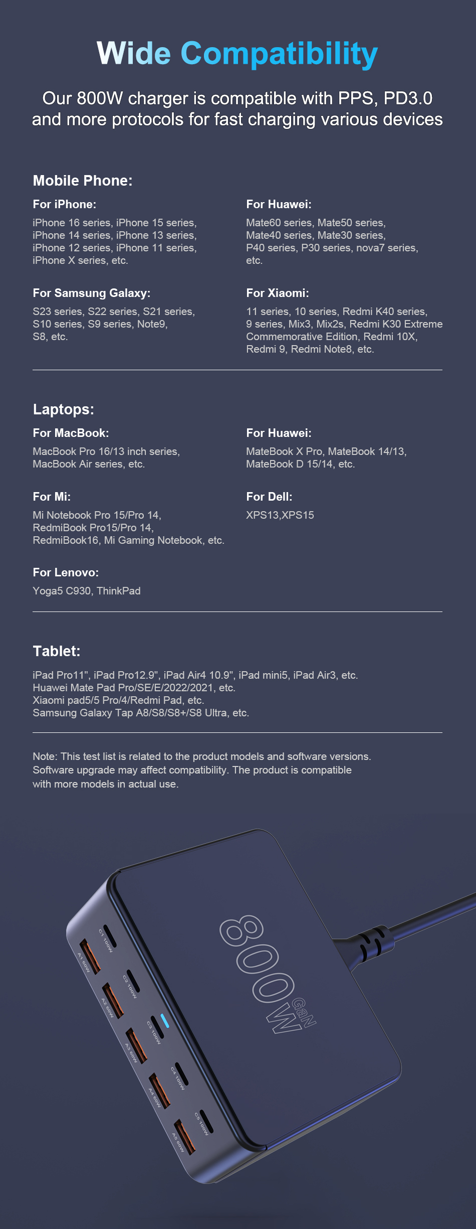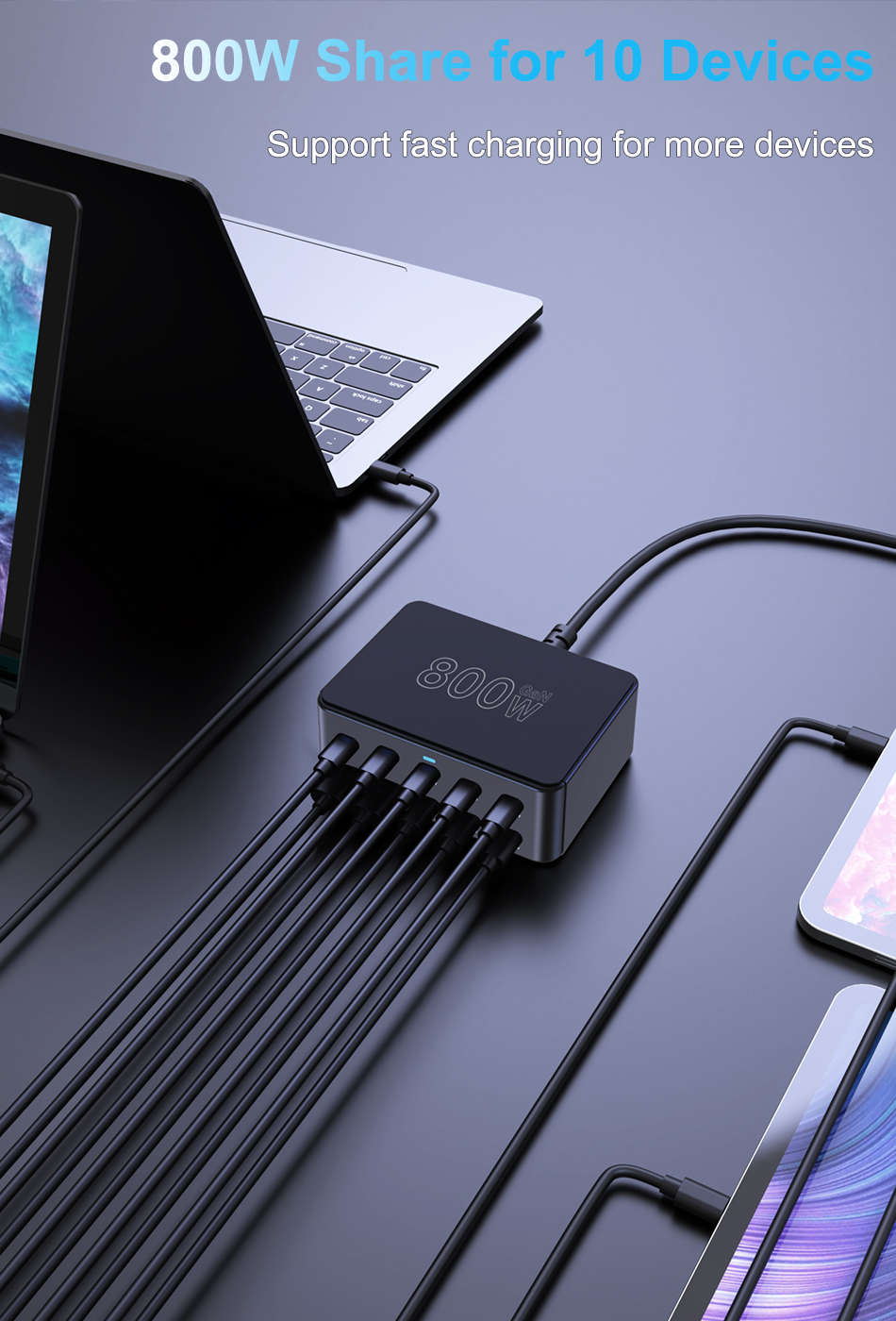 800W USB C GaN Charger 100W PD3.0 PPS QC3.0 Multiport Fast Charging Station for iPhone 15 16 Samsung Macbook Pro Laptops Tablets