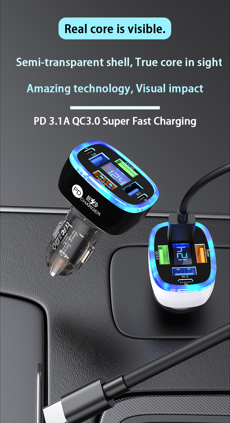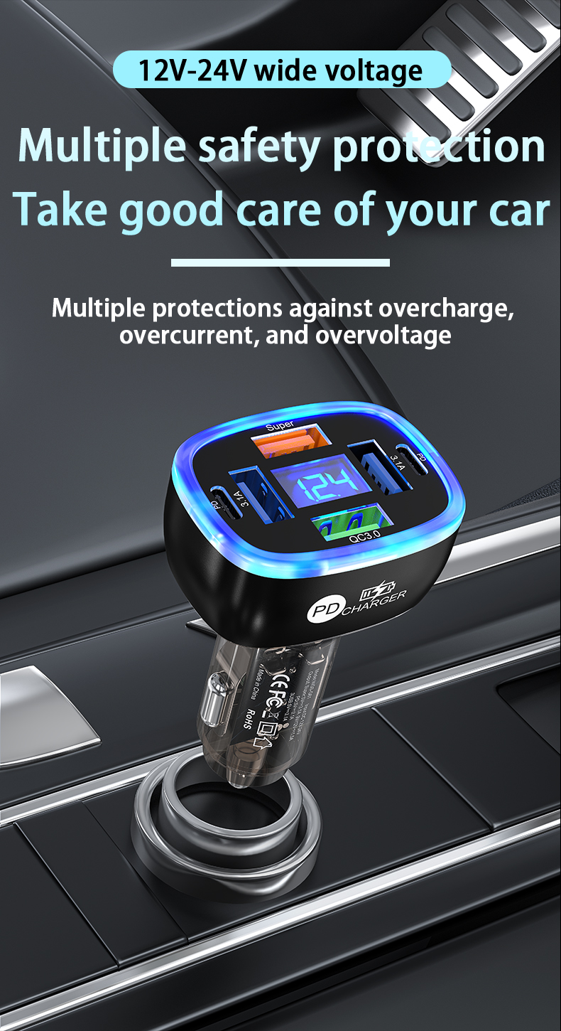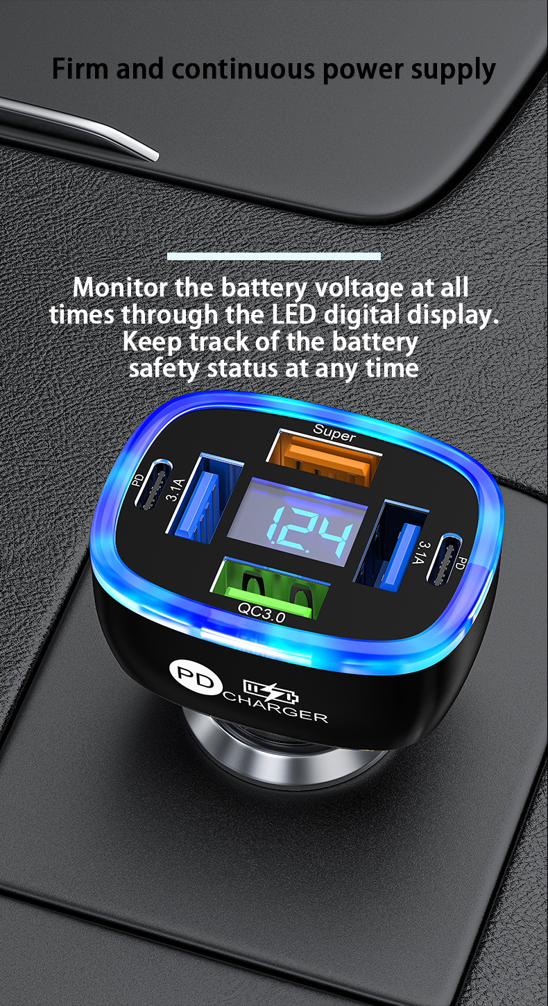 USB C Car Phone Charger 6 in 1 with Voltage Display Super Fast Charge Adapter for Samsung iPhone 16 15 Pro Max Oneplus